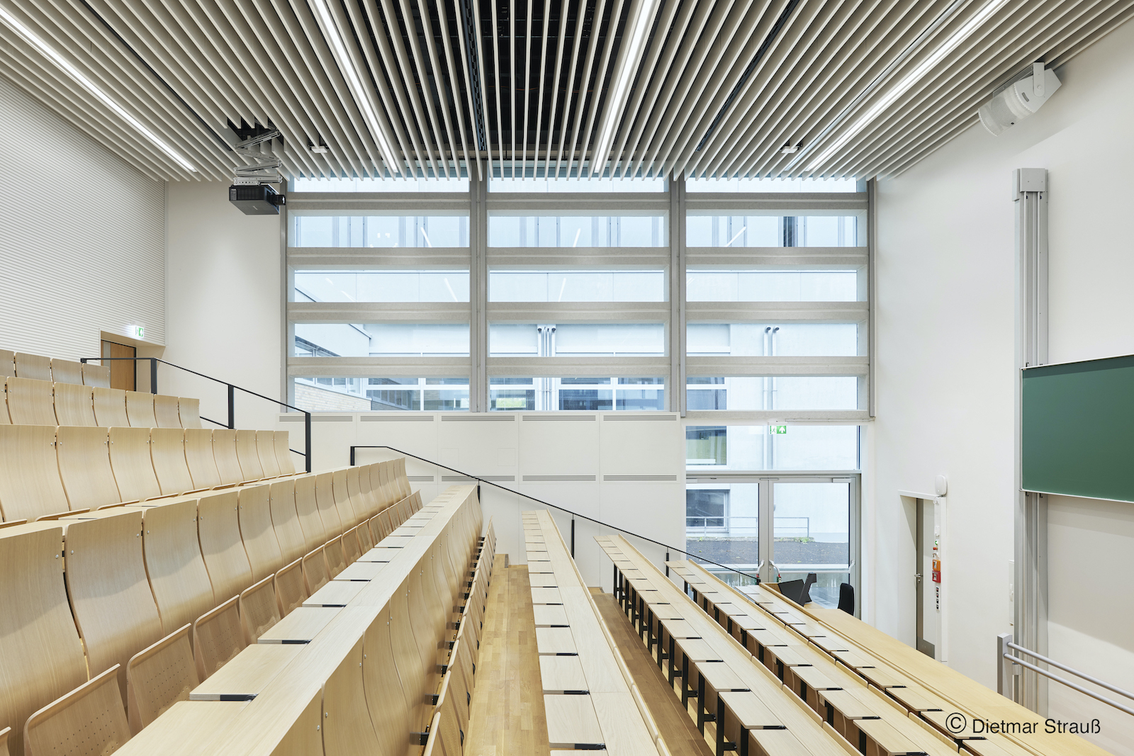 Zu den prägenden gestalterischen Eingriffen zählt die Neukonzeption des großen Physik-Hörsaals einschließlich des ansteigenden Gestühls und Integration modernster Medientechnik. Die Gestaltung des neuen Hörsaals ist durch weiße akustisch wirksame Innenwandbekleidungen und perforierte Akustik-Baffeln im Deckenbereich in Kombination mit dem Eichenholz der Bestuhlungselemente und dem Parkettbodenbelag geprägt.