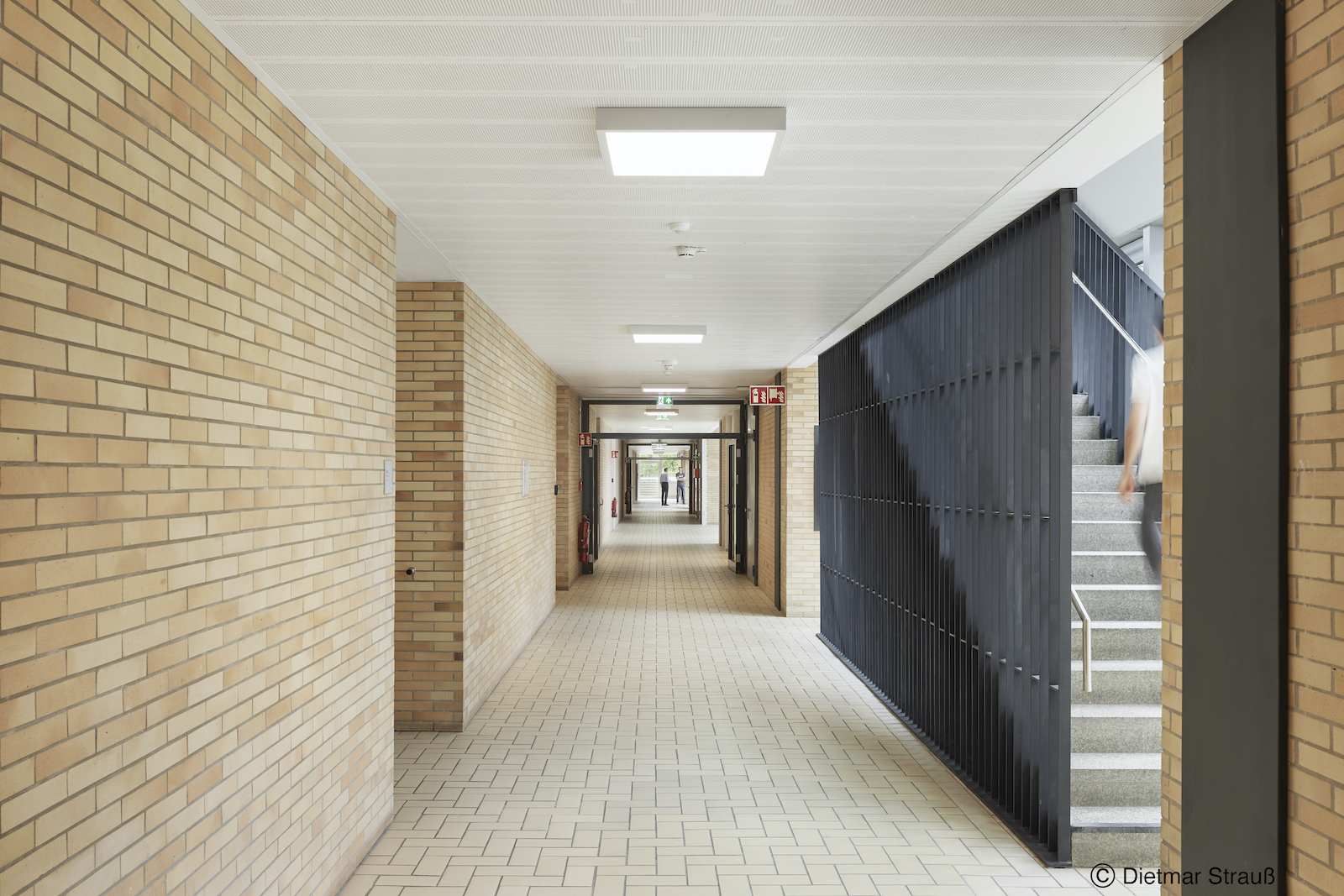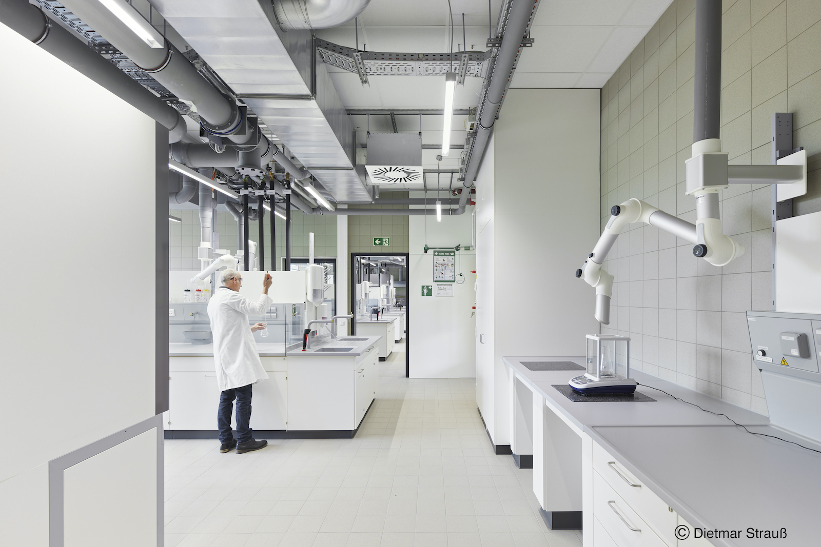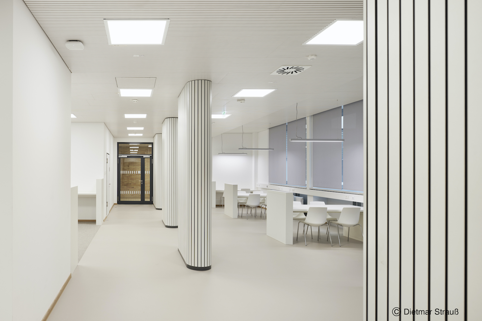 Die raumhohen Aluminium-Fensterbänder mit eloxierten Brüstungspaneelen sowie eichenfurnierte Innentüren folgen ebenfalls dem Konzept der Neuinterpretation vorhandener Bauteile. Ein besonderer Fokus lag auf den für Lehre und Forschung zentralen Laborbereichen. Die Fachbereiche Nasschemie, Optik, Akustik, Kunststofftechnik sowie Elektrotechnik / Mechatronik wurden modernisiert und an heutige Anforderungen angepasst.