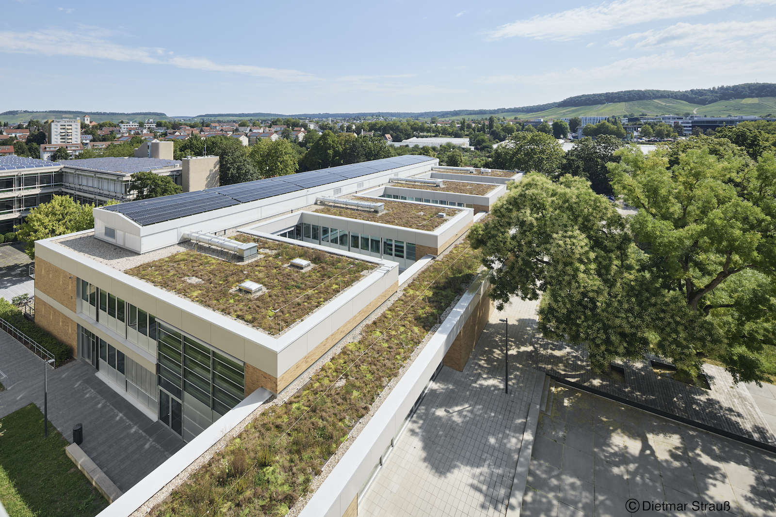 Das Bauteil D als Labor- und Vorlesungsgebäude der Hochschule Heilbronn am Standort Sontheim aus dem Jahr 1965, wurde in zwei aufeinanderfolgenden Bauphasen bei laufendem Betrieb umfassend saniert. Im Zuge dessen wurde ein aktualisiertes Raumkonzept umgesetzt. Ziel war es, die verschiedenen Nutzungen unter Berücksichtigung der vielfältigen Anforderungen neu zu organisiert. Ergänzt wurde der Ost-West ausgerichtete Gebäudeflügel durch einen Technikaufbau auf der Dachfläche.