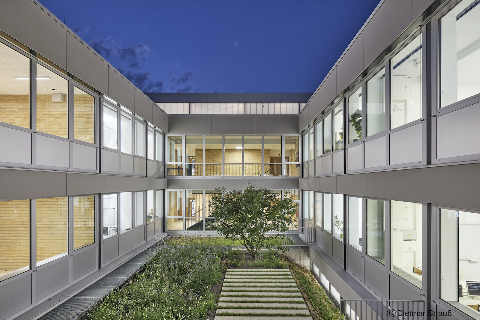 Alle vorhandenen Flachdächer wurden begrünt und mit Photovoltaikmodulen ausgestattet. Die neu errichtete Technikzentrale als Stahl-Skelettkonstruktion wirkt durch ihre lichtdurchlässige Polycarbonatfassade und die gewählte Dachform als „Flügel“ nahezu schwebend über dem Hauptbaukörper und ist von unten kaum wahrnehmbar.
