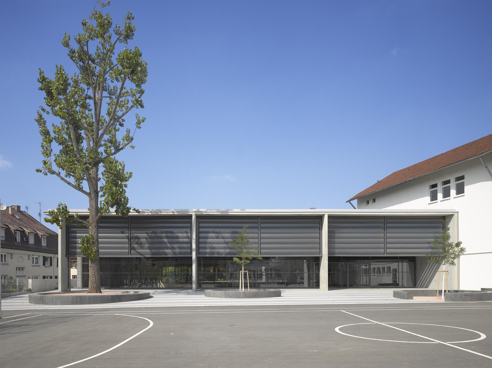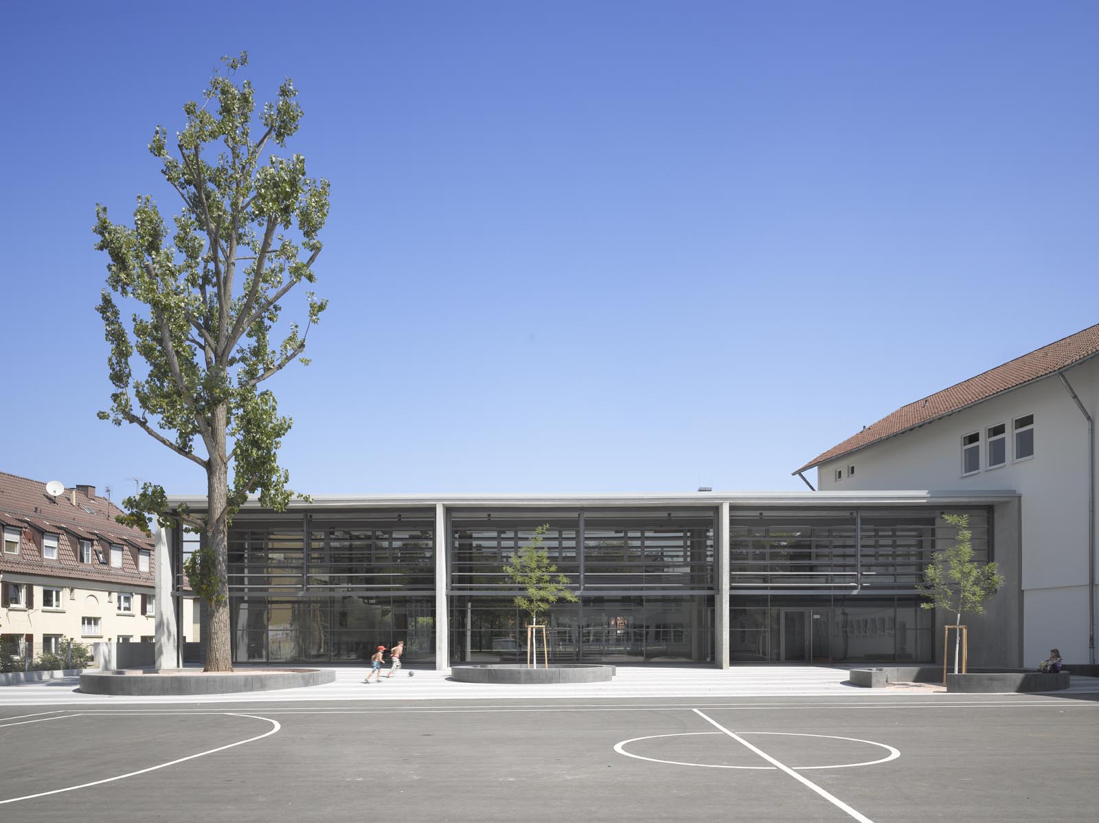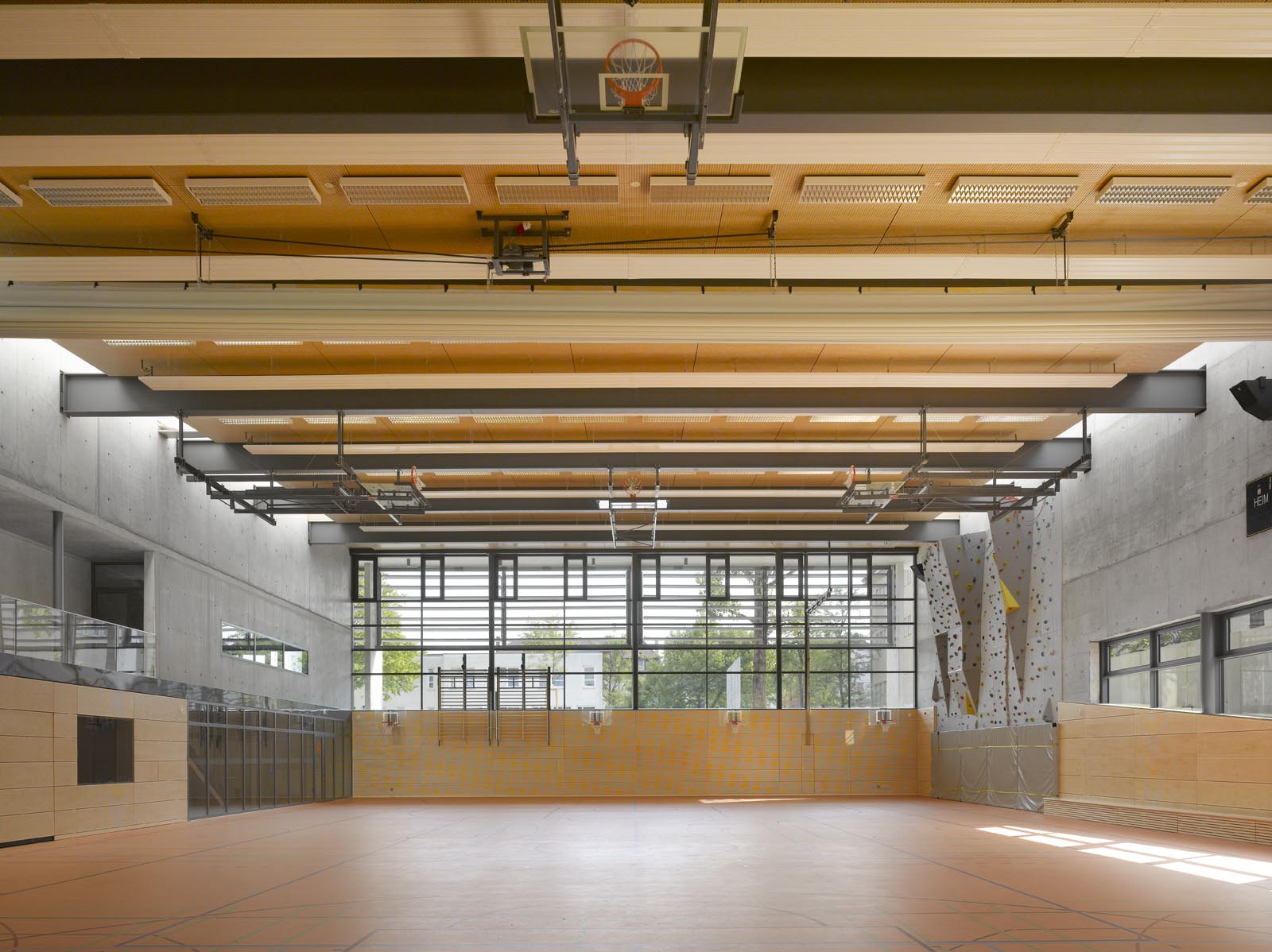 Eines der zentralen städtebaulichen Ziele war die maßstabsgerechte Einfügung des großen Hallenvolumens in die vorhandene Baustruktur. Die Sporthalle ist um ein Geschoss abgesenkt, ihre Schmalseite mit dem filigranen Pausendach bildet die Sichtseite zum Schulhof. Der Baukörper besteht aus einem schlanken, kubischen Nebenraumtrakt auf der Ostseite und dem eigentlichen Hallenbaukörper auf der Westseite. Eine Wandscheibe an der Galeriekante, der Nahtstelle zwischen beiden Gebäudeteilen, durchtrennt die Dachscheibe. Der östliche Teil des Dachs ist flach, westlich der Schnittlinie ist das Dach leicht gekrümmt und fällt nach Norden hin ab.