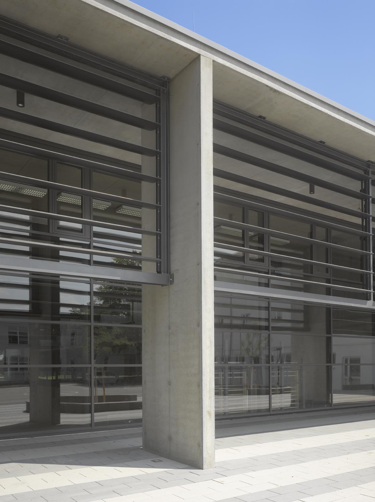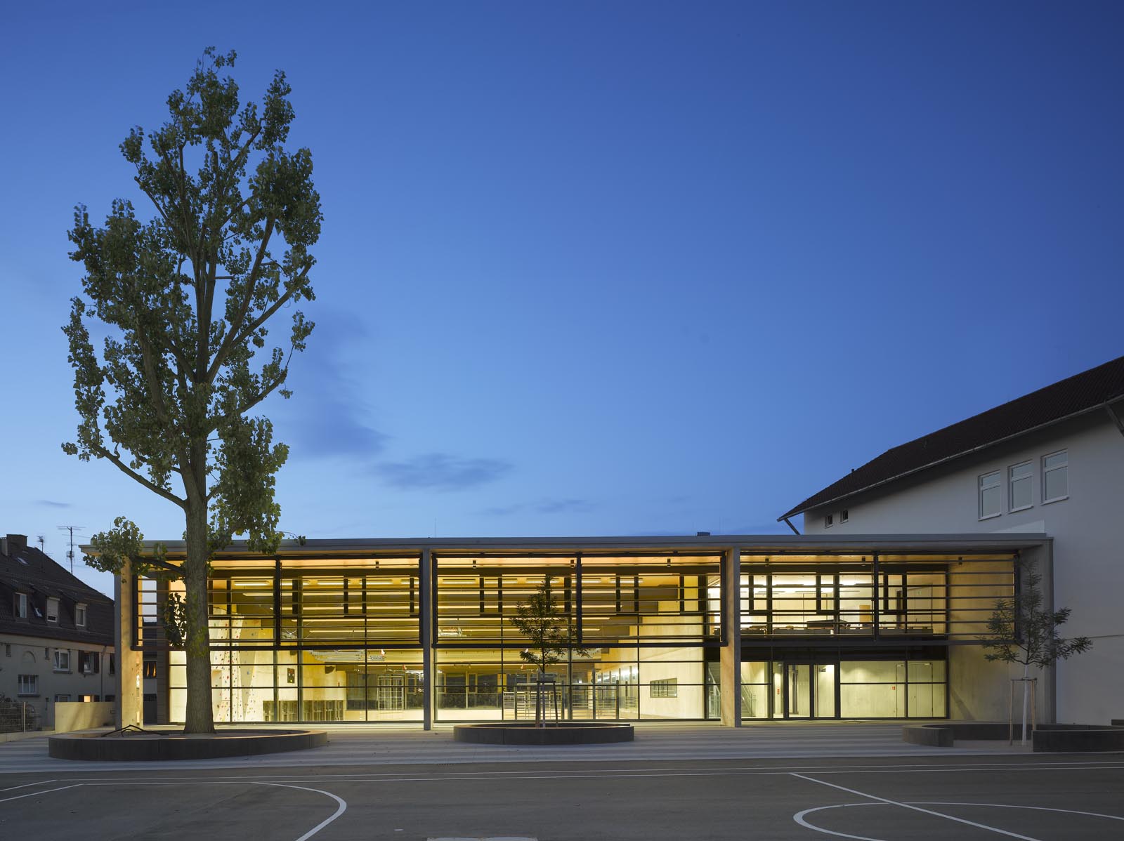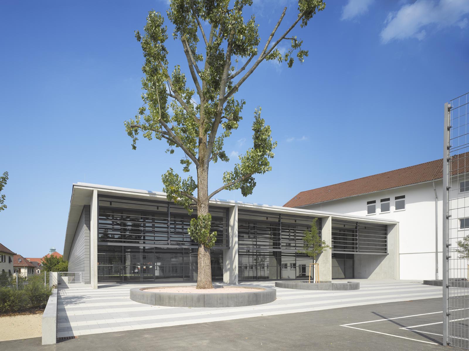 Eines der zentralen städtebaulichen Ziele war die maßstabsgerechte Einfügung des großen Hallenvolumens in die vorhandene Baustruktur. Die Sporthalle ist um ein Geschoss abgesenkt, ihre Schmalseite mit dem filigranen Pausendach bildet die Sichtseite zum Schulhof. Der Baukörper besteht aus einem schlanken, kubischen Nebenraumtrakt auf der Ostseite und dem eigentlichen Hallenbaukörper auf der Westseite. Eine Wandscheibe an der Galeriekante, der Nahtstelle zwischen beiden Gebäudeteilen, durchtrennt die Dachscheibe. Der östliche Teil des Dachs ist flach, westlich der Schnittlinie ist das Dach leicht gekrümmt und fällt nach Norden hin ab.